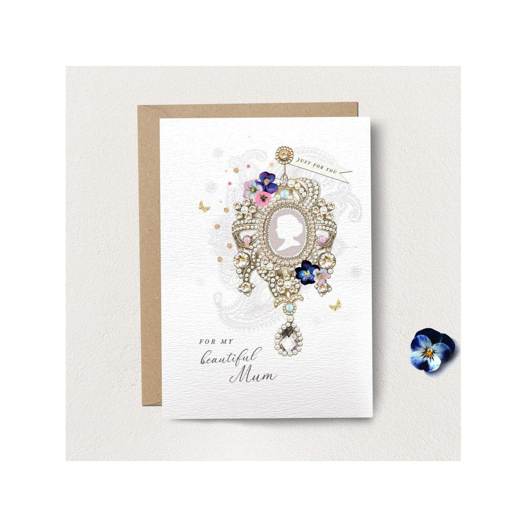 From the 'Curiosities' collection, this greetings card features an illustrated brooch filled with little details and illustrated gemstones. This card is hand embellished with gold glitter and a genuine Crystal from Swarovski®. Perfect to send either for Mother's day or for a birthday.